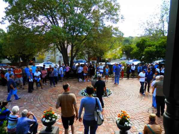 Around 100 adults and quite a few children spread out at the top of the hill of this cul-de-sac…
