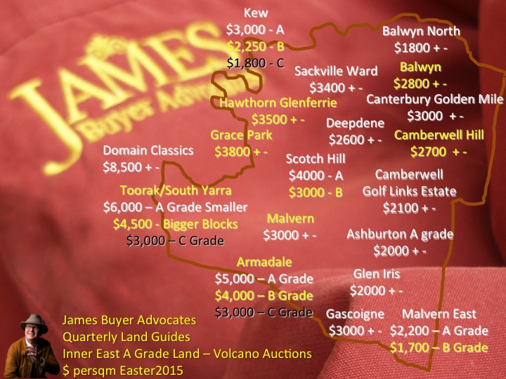 A-grade land in Balwyn at Easter 2015 is now firmly at $3000 per square metre. This is evidenced by multiple sales, including the auction we were at over the long weekend at 58 Metung Avenue, Balwyn (Pat Dennis).